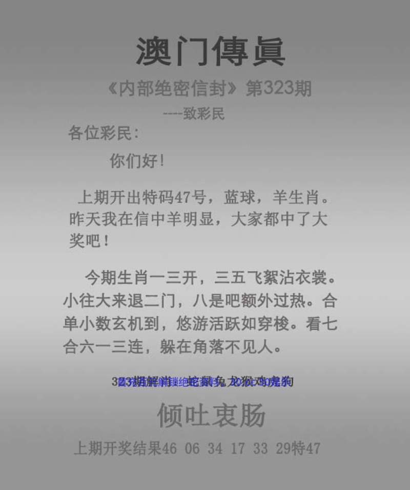 | 325期精解传真: 今期生肖二三开,三八送礼中四千。 蜿蜓曲折毒气涌,是双又逢旺木春。 却有天间两阴会,春天里头开红花。 特码爆冷玄机中,心猿意马何中叹。 各霸一方 解:今期蜿蜓曲折毒气涌,解阴肖鼠龙蛇马狗猪,春天里头开红花,解红肖马兔鼠鸡。 综合:鼠蛇兔龙猴羊鸡狗猪 主特:18.25.03.14.10.11.21.44.31 |