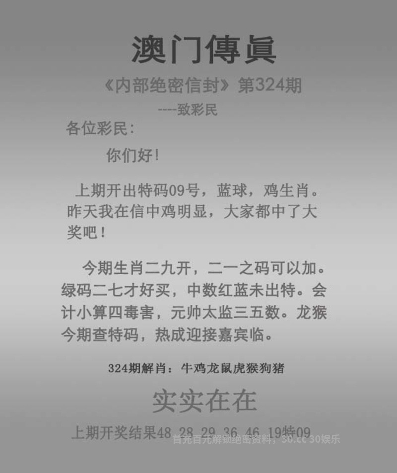 | 324期精解传真: 今期生肖二九开,二一之码可以加。 绿码二七才好买,中数红蓝未出特。 会计小算四毒害,元帅太监三五数。 龙猴今期查特码,热成迎接嘉宾临。 实实在在 解:今期绿码二七才好买,解绿波,会计小算四毒害,解凶丑生肖鼠牛虎猴狗猪。 综合:鼠牛羊兔虎狗鸡马猪 |